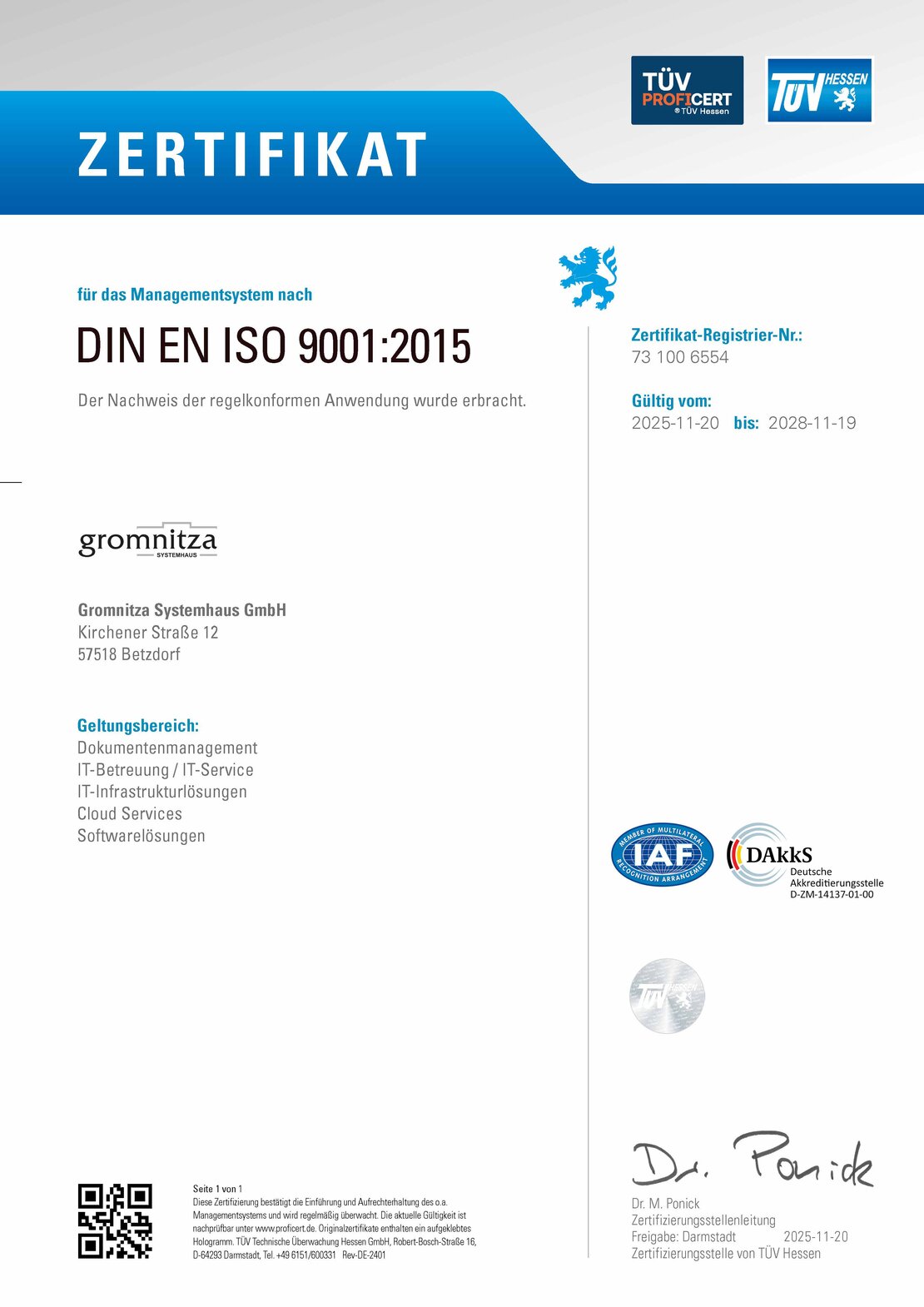 Wir freuen uns, mitteilen zu können, dass wir beim Gromnitza Systemhaus erfolgreich die ISO 9001-Rezertifizierung und die ISO 27001-Zertifizierung bestanden haben. Diese Erfolge unterstreichen unseren kontinuierlichen Anspruch an höchste Qualitätsstandards und Informationssicherheit in allen Bereichen unseres Unternehmens.